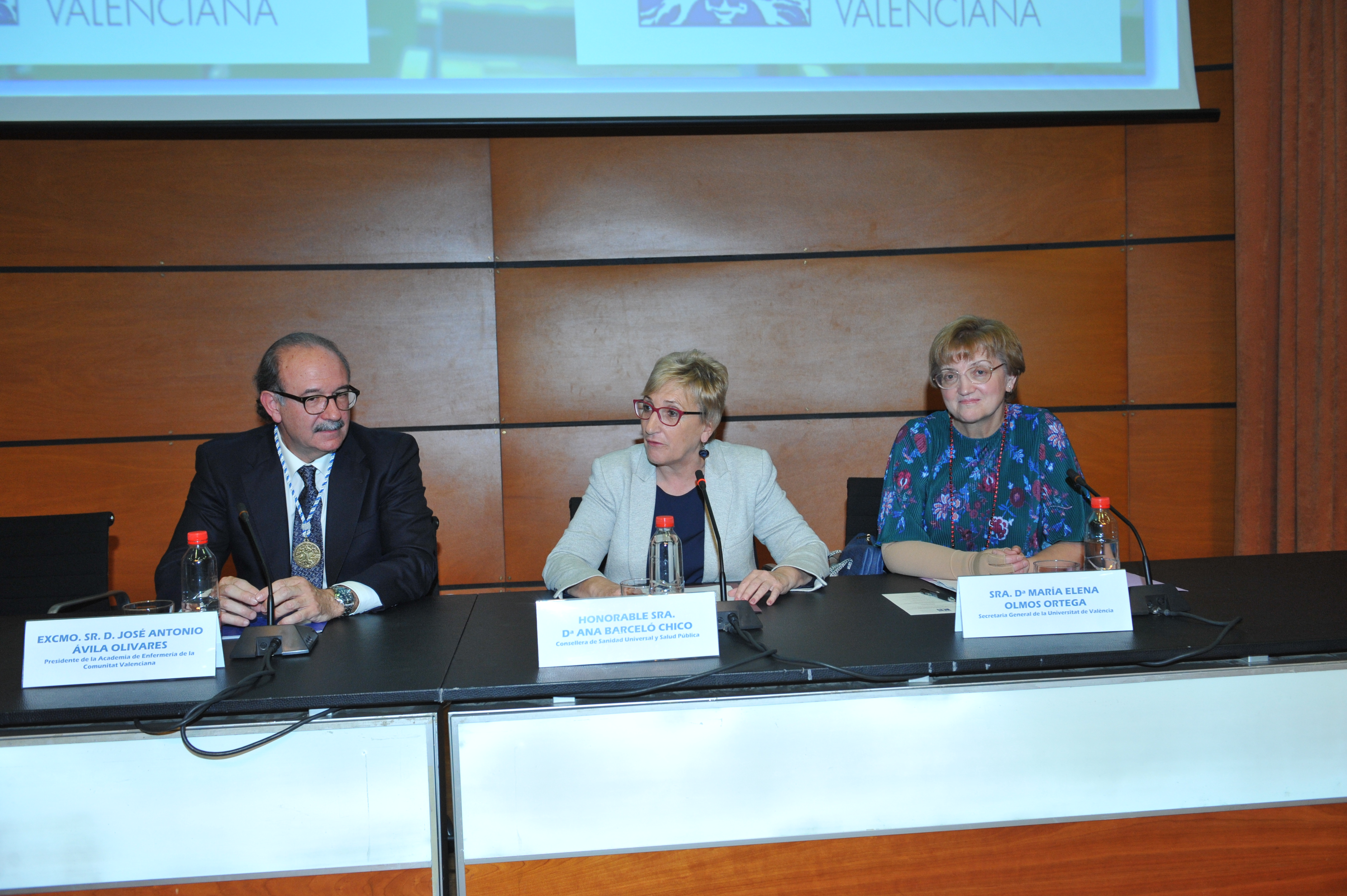 El Acto fue presidido por el D. José Antonio Ávila Olivares, Académico Numerario y Presidente del CECOVA (Consejo de Enfermería de la Comunitat Valenciana), la Mesa presidencial estuvo constituida además por la Secretaria General de la Universitat de València, Dª María Elena Olmos y por otra parte, la Consellera de Sanitat de la Generalitat Valenciana, Dª. Ana Barceló Chico.